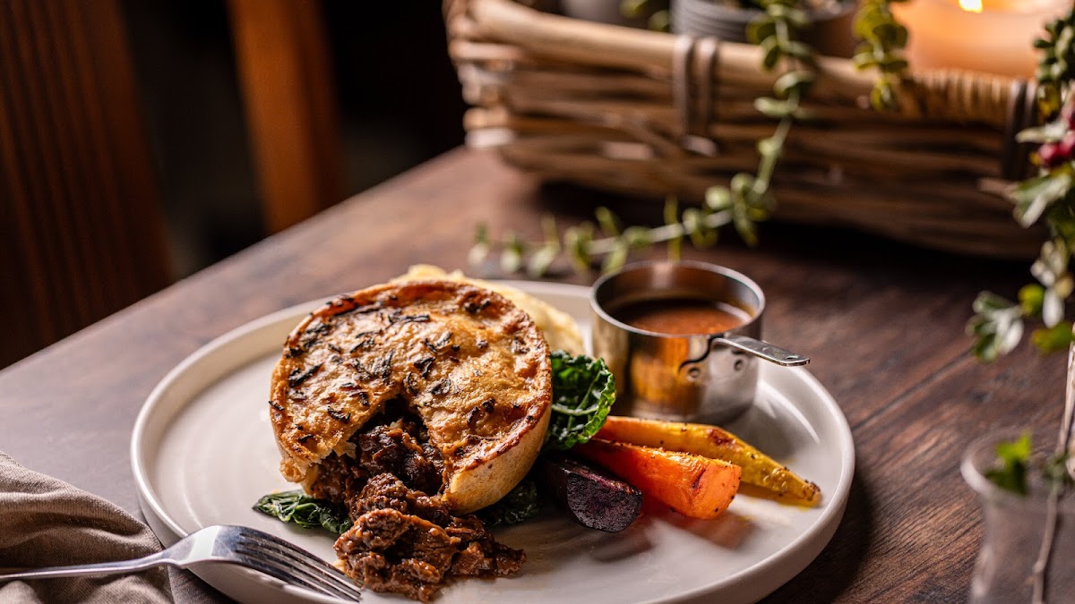 Beautiful pub and very good food. We were lucky to walk-in and find a table for two for a late lunch, around 2pm, as it was packed. However, it being a popular spot and a market day in Ludlow, we waited a long time to recieve our meals, as the kitchen was backed up with orders before ours. (Long enough for me to walk to my car, parked at Tesco, and move it closer by, thankfully!) We ordered the (vegetarian option) Wild Mushroom Bourguignon pie, and Venison (not vegetarian by any means), both came with potatoes, roasted root vegetables and delicious gravies. The wait staff were very friendly and accommodating of our needs. Tables were set with candles, and the interior was very cosy in general. A pleasant experience, one I'd repeat.